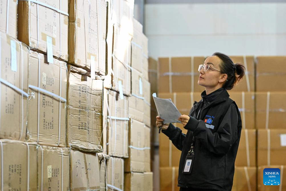A staff member checks exported goods at a logistics center in the comprehensive bonded zone in Kashgar Prefecture, northwest China's Xinjiang Uygur Autonomous Region, Nov. 4, 2023. (Xinhua/Ding Lei)