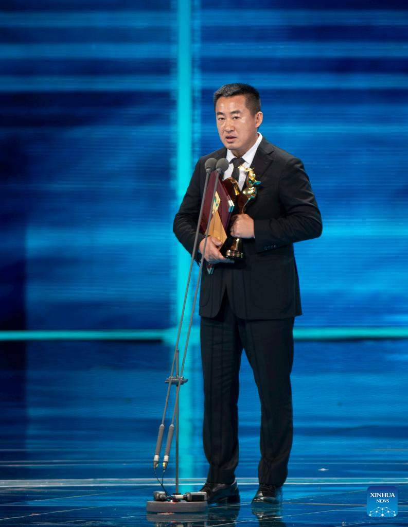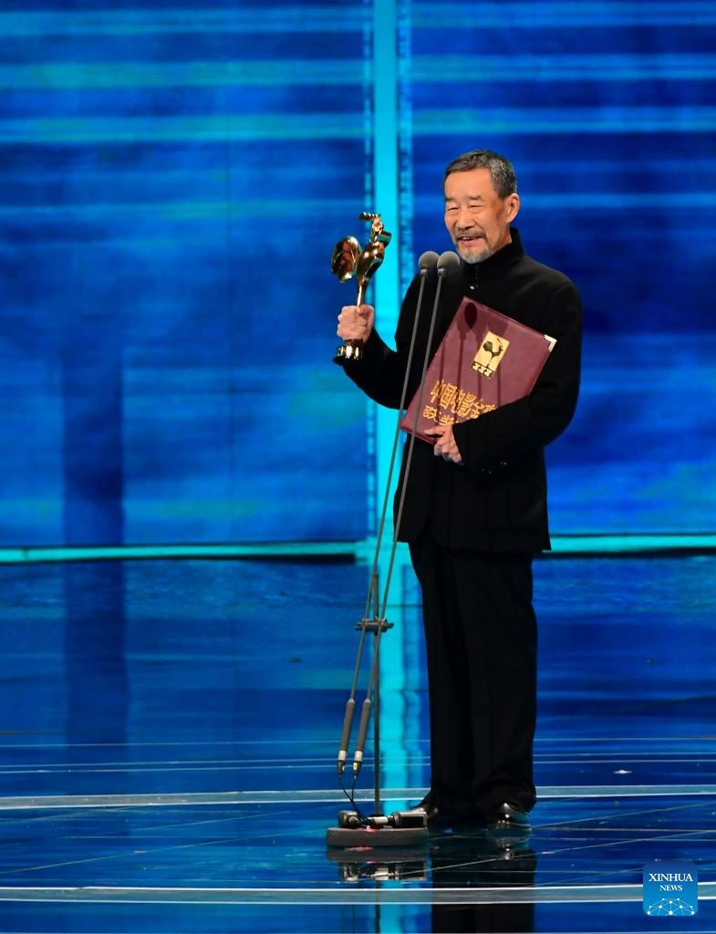 Li Xuejian wins the best supporting actor award for his performance in "Creation of the Gods I: Kingdom of Storms" during the awarding ceremony of the 36th Golden Rooster Awards in Xiamen, southeast China's Fujian Province, Nov. 4, 2023. Winners of the 36th Golden Rooster Awards were announced Saturday evening in Xiamen. (Xinhua/Wei Peiquan)