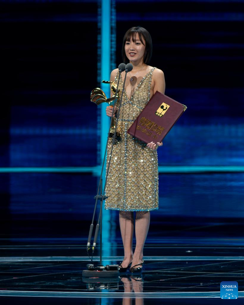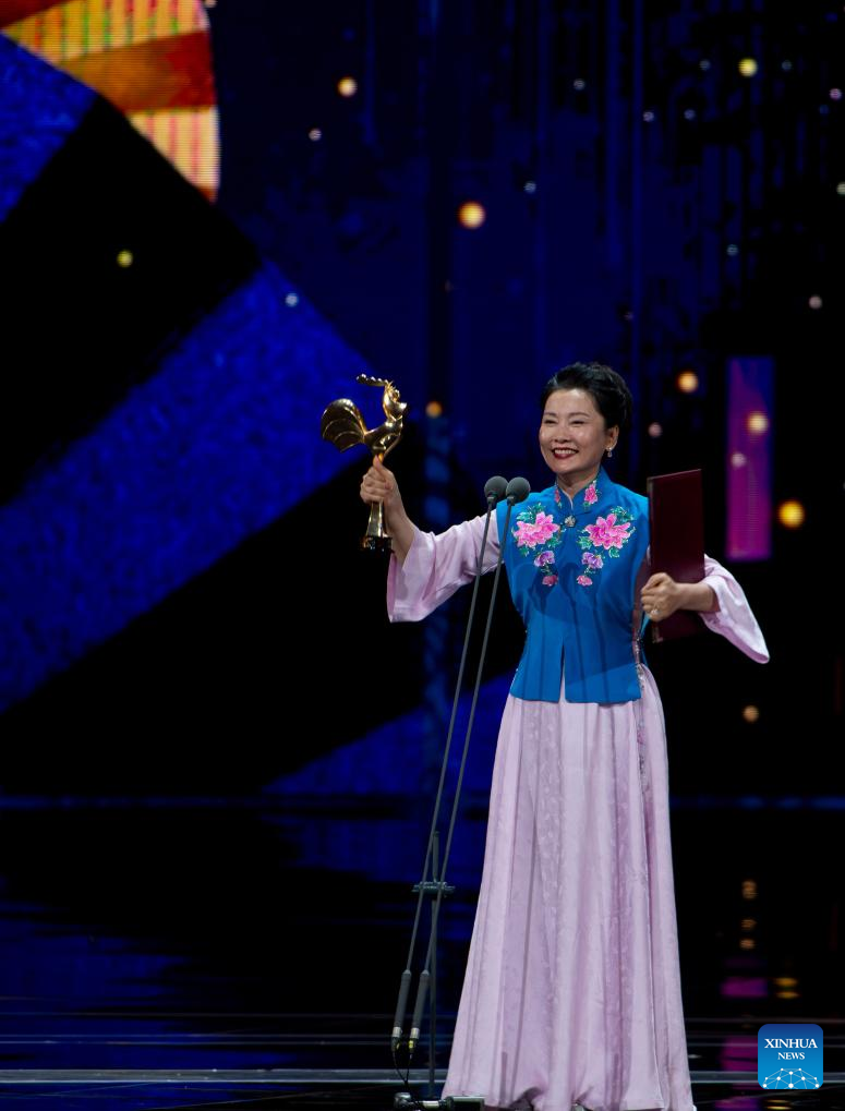 He Saifei wins the best actress award for her performance in "Off the Stage" during the awarding ceremony of the 36th Golden Rooster Awards in Xiamen, southeast China's Fujian Province, Nov. 4, 2023. Winners of the 36th Golden Rooster Awards were announced Saturday evening in Xiamen. (Xinhua/Wei Peiquan)