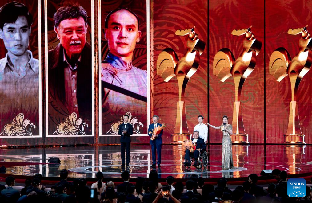 Da Shichang (2nd L) and Zhai Junjie (2nd R, front) are honored with the lifetime achievement award during the awarding ceremony of the 36th Golden Rooster Awards in Xiamen, southeast China's Fujian Province, Nov. 4, 2023. Winners of the 36th Golden Rooster Awards were announced Saturday evening in Xiamen. (Xinhua/Wei Peiquan)