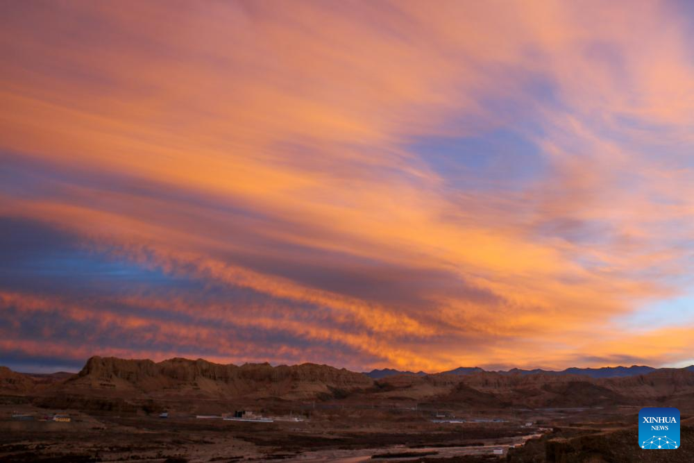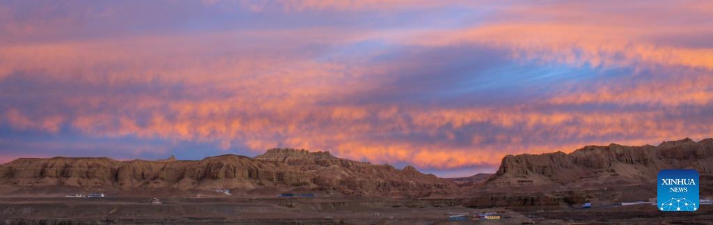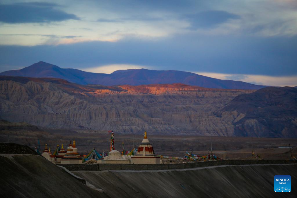 This photo taken on Nov. 3, 2023 shows the landscape of earth forest during dawn in Zanda County of Ngari Prefecture, southwest China's Tibet Autonomous Region. Zanda is famous for the unique landscape of earth forest. With gullies, ravines and steep mountainsides, the unique landscape was shaped as a result of gradual geological movements of the Himalayan region ever since the Quaternary Period from 2.5 million years ago and the impact of perennial water erosion and airslaking. (Xinhua/Nie Yi)