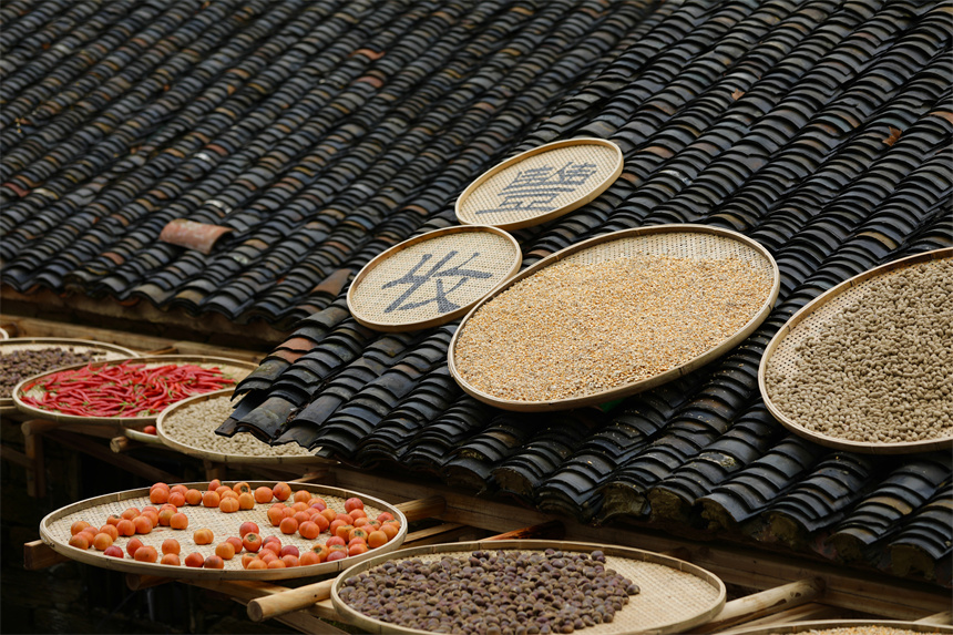 Crops are spread and dried openly under the sun in the Dayuwan Scenic Area, located in Huangpi district of Wuhan in central China's Hubei Province. (Photo/Huang Xuan)