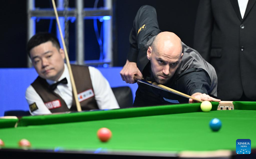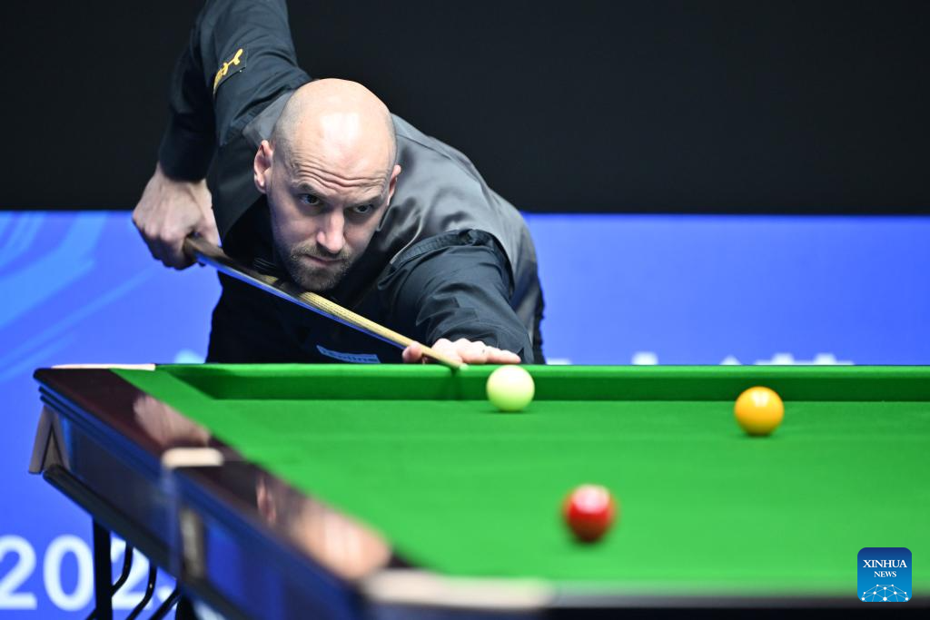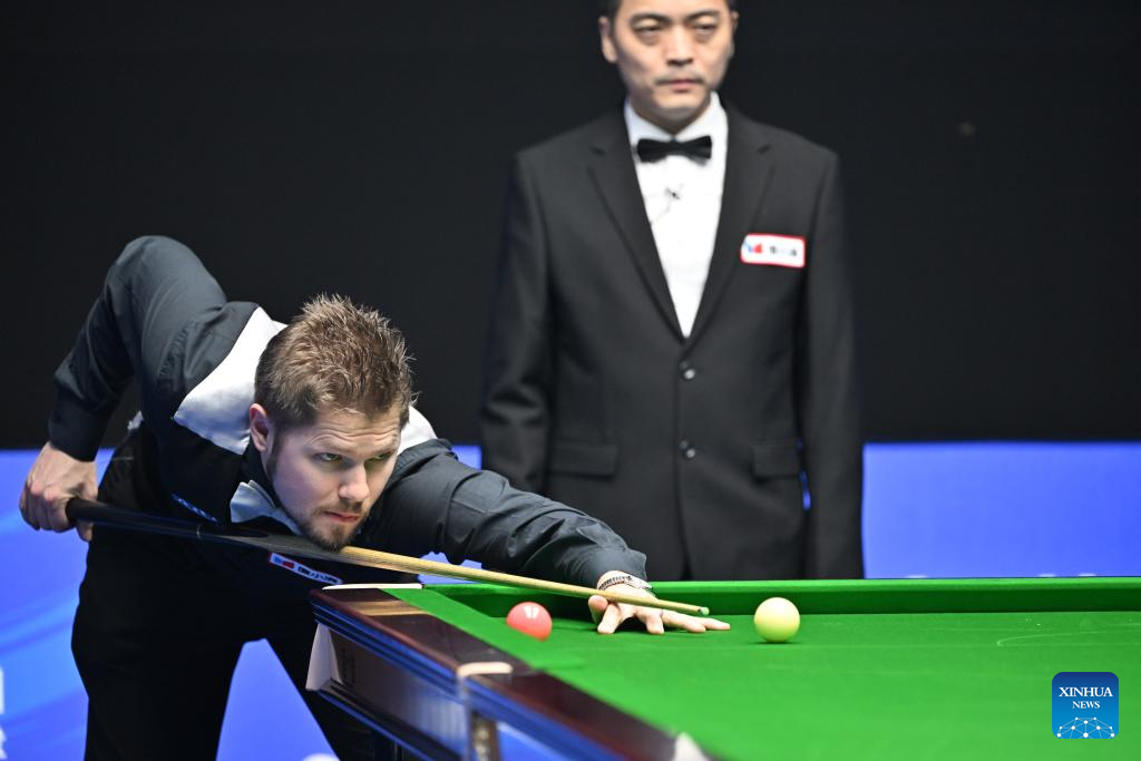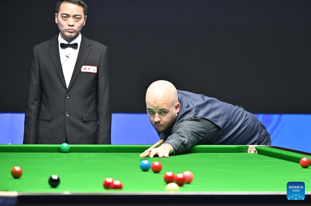 Luca Brecel (R) of Belgium competes during the round 1 match between Luca Brecel of Belgium and Daniel Womersley of England at World Snooker International Championship 2023 in north China's Tianjin Municipality, Nov. 5, 2023. (Xinhua/Li Ran)