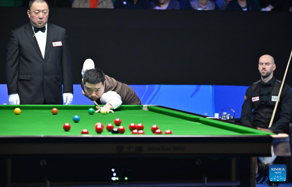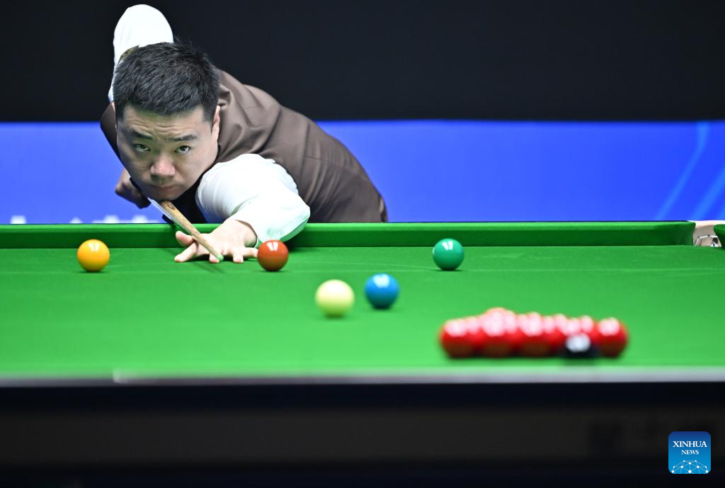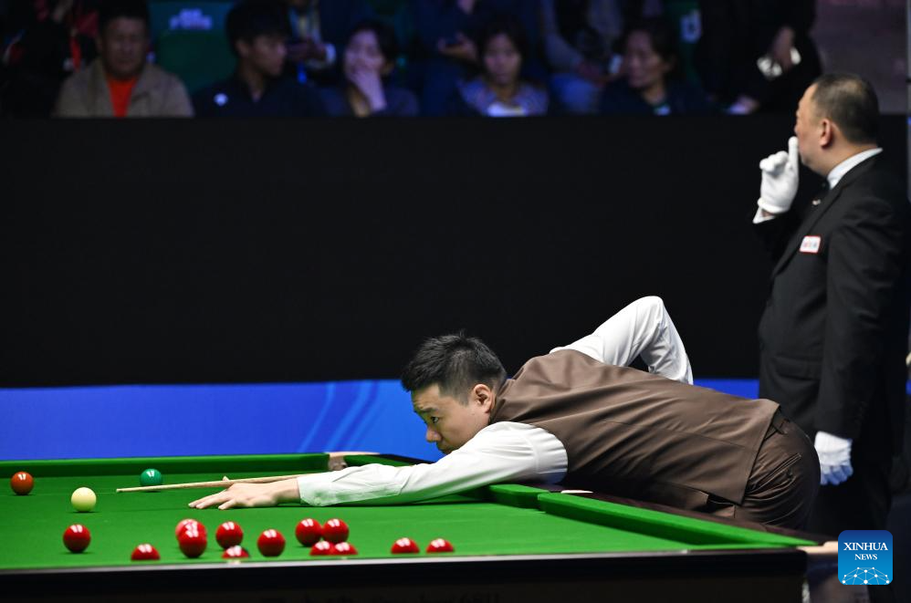 Ding Junhui (C) competes during the round 1 match between Ding Junhui of China and Ian Burns of England at World Snooker International Championship 2023 in north China's Tianjin Municipality, on Nov. 5, 2023. (Xinhua/Li Ran)