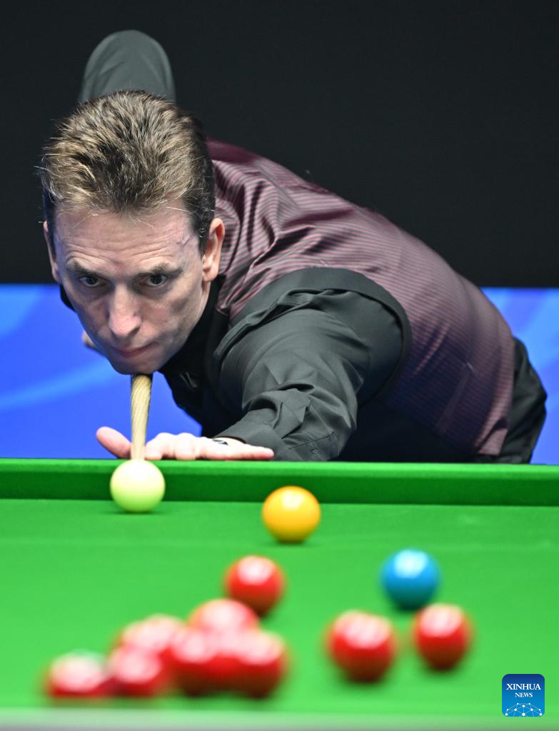 Ken Doherty of Ireland competes during the round 1 match between Ronnie O'Sullivan of England and Ken Doherty of Ireland at World Snooker International Championship 2023 in north China's Tianjin Municipality, Nov. 5, 2023. (Xinhua/Li Ran)