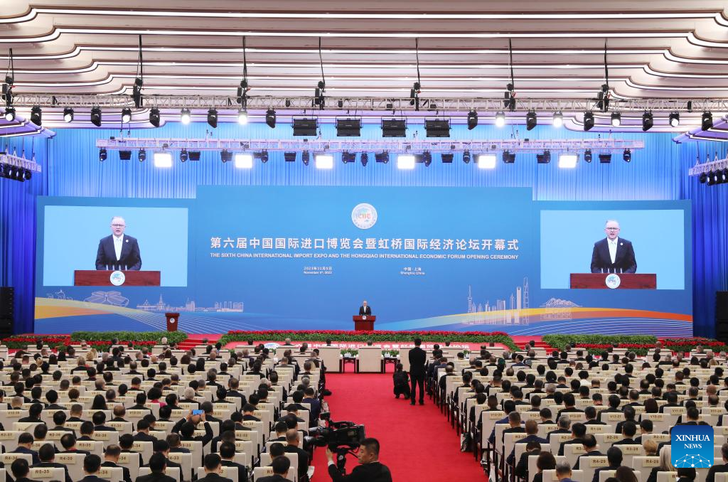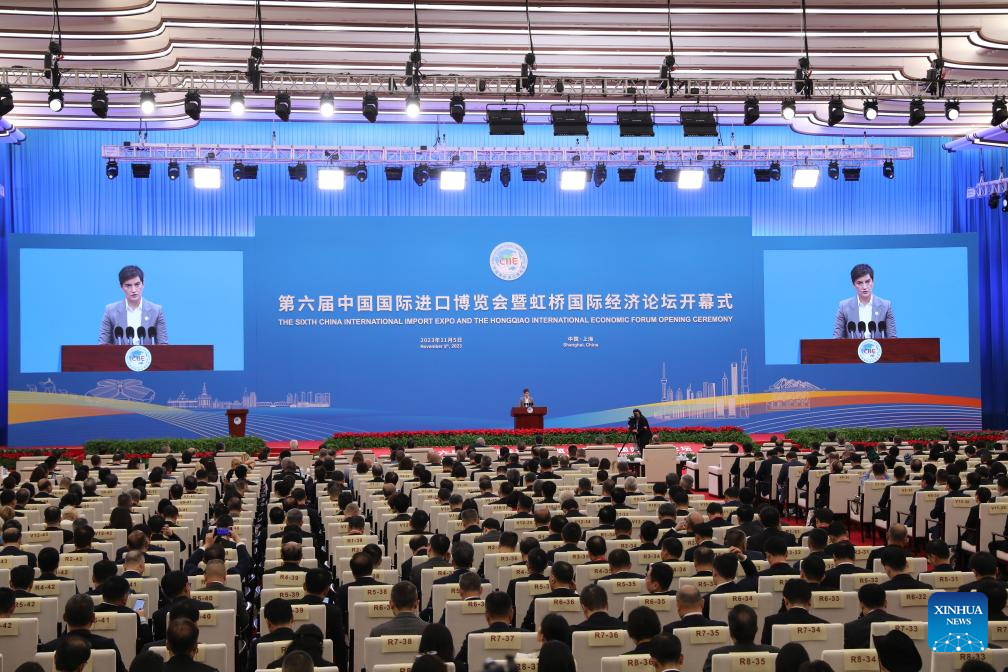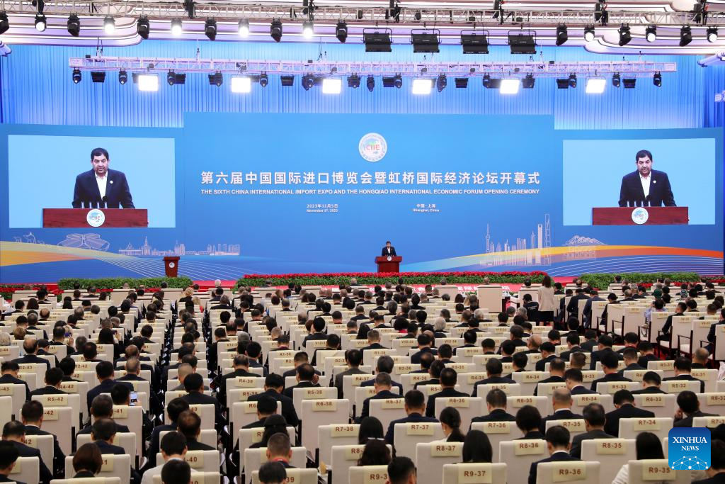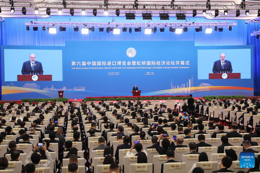 Cuban Prime Minister Manuel Marrero Cruz addresses the opening ceremony of sixth China International Import Expo (CIIE) and the Hongqiao International Economic Forum in east China's Shanghai, Nov. 5, 2023. (Xinhua/Jin Liwang)