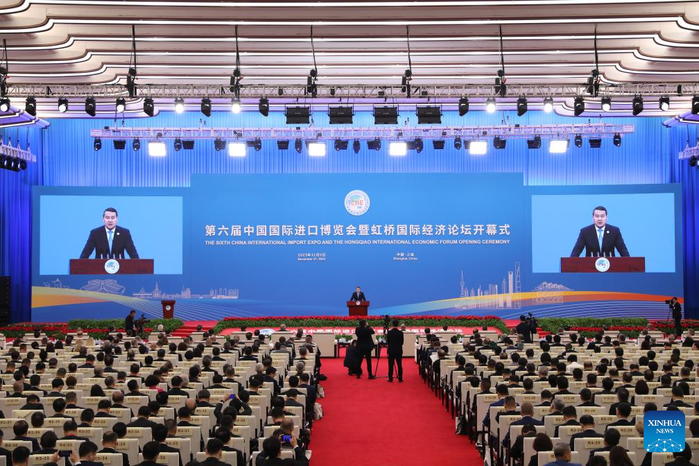Prime Minister of Kazakhstan Alikhan Smailov addresses the opening ceremony of sixth China International Import Expo (CIIE) and the Hongqiao International Economic Forum in east China's Shanghai, Nov. 5, 2023. (Xinhua/Jin Liwang)