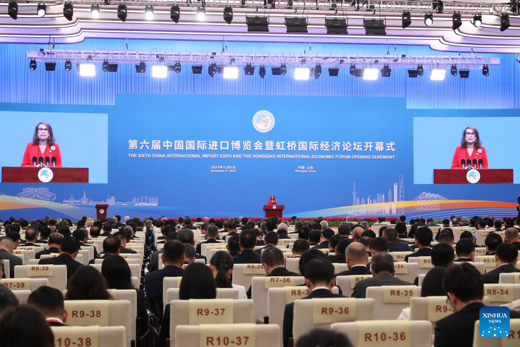 Rebeca Grynspan, secretary-general of the United Nations Conference on Trade and Development (UNCTAD), addresses the opening ceremony of sixth China International Import Expo (CIIE) and the Hongqiao International Economic Forum in east China's Shanghai, Nov. 5, 2023. (Xinhua/Fang Zhe)