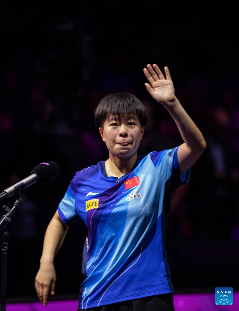 Wang Yidi of China greets the spectators after winning the women's singles final match against Wang Manyu of China at the WTT Champions Frankfurt 2023 in Frankfurt, Germany, Nov. 5, 2023. (Xinhua/Zhang Fan)