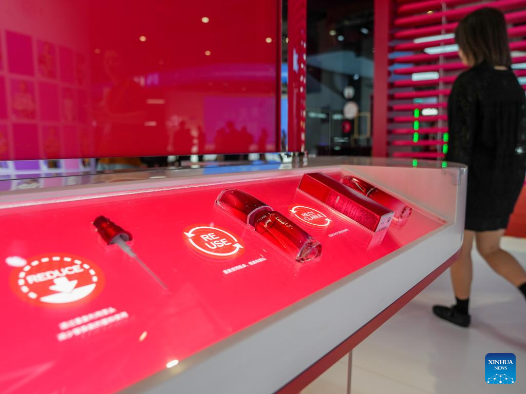 This photo taken on Nov. 5, 2023 shows Shiseido's sustainable packaging at the 6th China International Import Expo (CIIE) in east China's Shanghai. The 6th China International Import Expo kicked off here on Sunday, with many cutting-edge technologies and new products making their debuts at the event. (Xinhua/Ding Ting)
