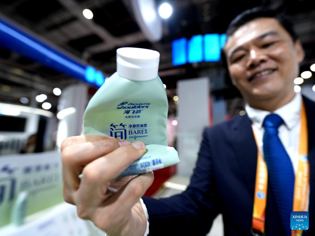 An exhibitor introduces P&G's sustainable packaging at the 6th China International Import Expo (CIIE) in east China's Shanghai, Nov. 5, 2023. The 6th China International Import Expo kicked off here on Sunday, with many cutting-edge technologies and new products making their debuts at the event. (Xinhua/Zhang Jiansong)