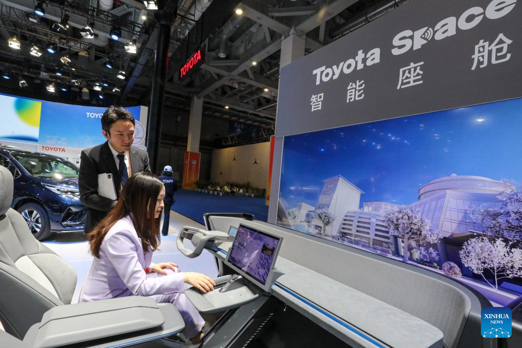 A reporter experiences Toyota Space, a cockpit solution at the 6th China International Import Expo (CIIE) in east China's Shanghai, Nov. 5, 2023. The 6th China International Import Expo kicked off here on Sunday, with many cutting-edge technologies and new products making their debuts at the event. (Xinhua/Xin Mengchen)