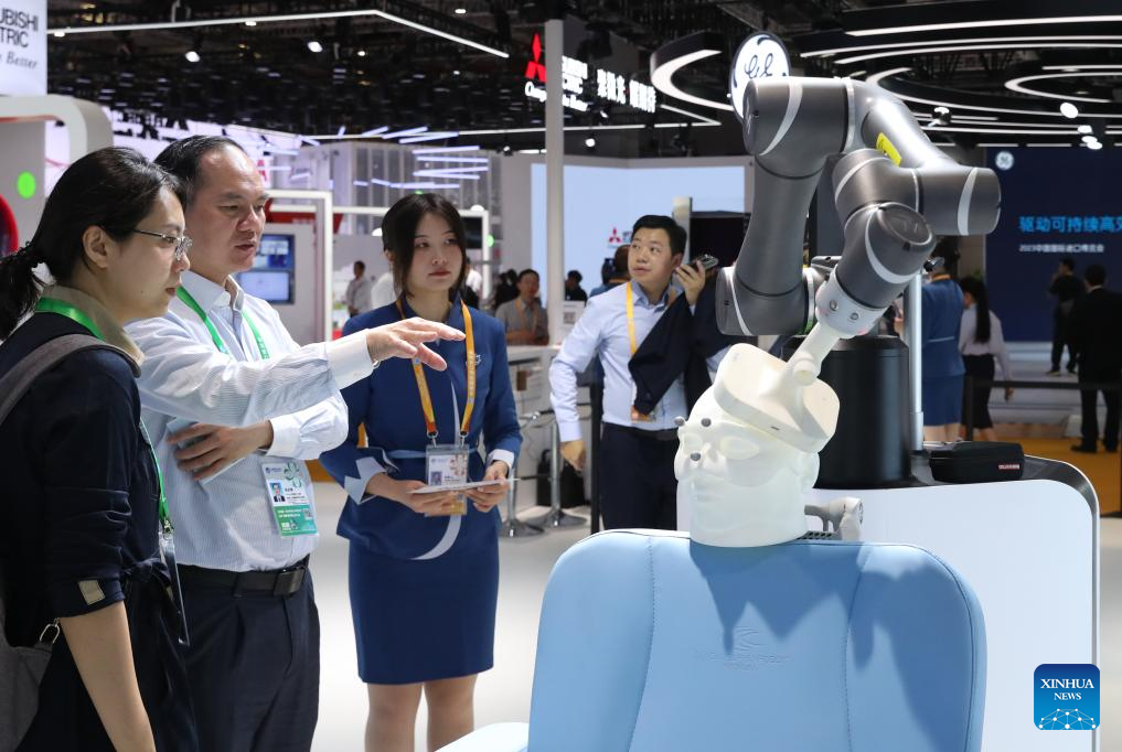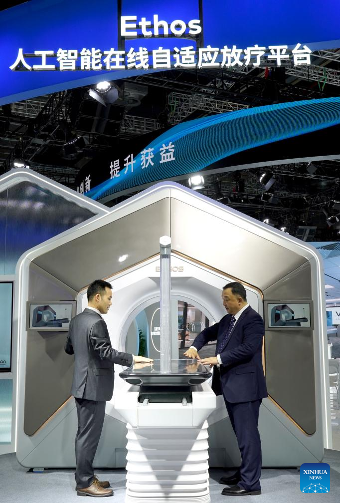 Exhibitors introduce Varian's Ethos online adaptive radiotherapy system at the 6th China International Import Expo (CIIE) in east China's Shanghai, Nov. 5, 2023. The 6th China International Import Expo kicked off here on Sunday, with many cutting-edge technologies and new products making their debuts at the event. (Xinhua/Liu Ying)