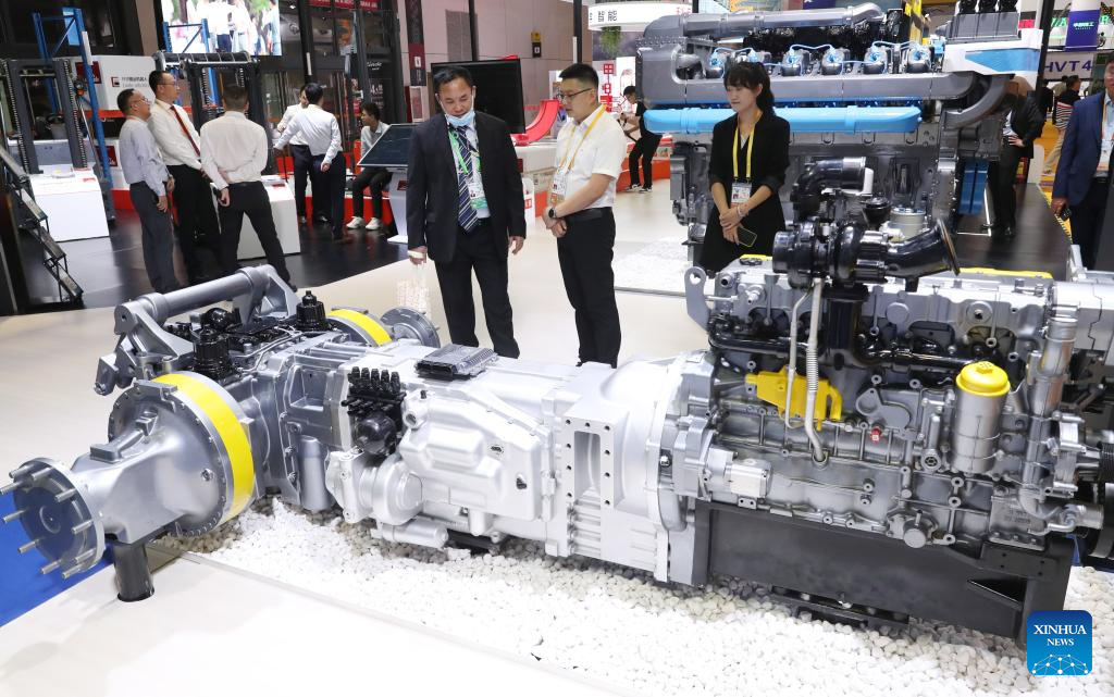 Visitors look at a model of Linde's CVT for tractor at the 6th China International Import Expo (CIIE) in east China's Shanghai, Nov. 5, 2023. The 6th China International Import Expo kicked off here on Sunday, with many cutting-edge technologies and new products making their debuts at the event. (Xinhua/Fang Zhe)