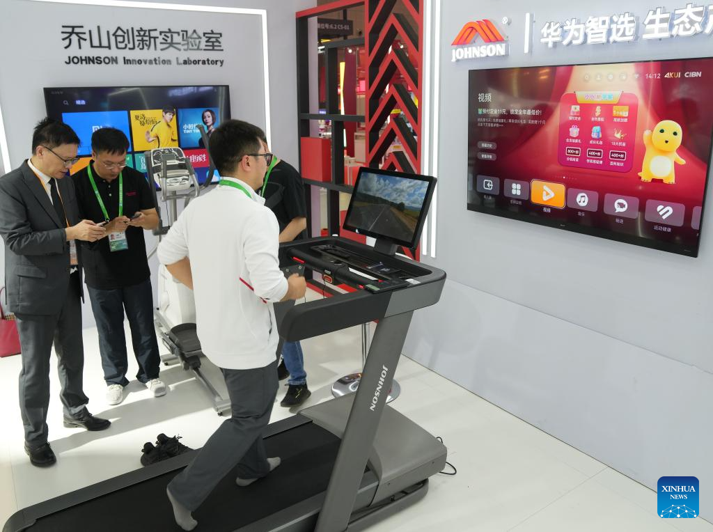 A visitor tries Johnson's treadmill at the 6th China International Import Expo (CIIE) in east China's Shanghai, Nov. 5, 2023. The 6th China International Import Expo kicked off here on Sunday, with many cutting-edge technologies and new products making their debuts at the event. (Xinhua/Ding Ting)
