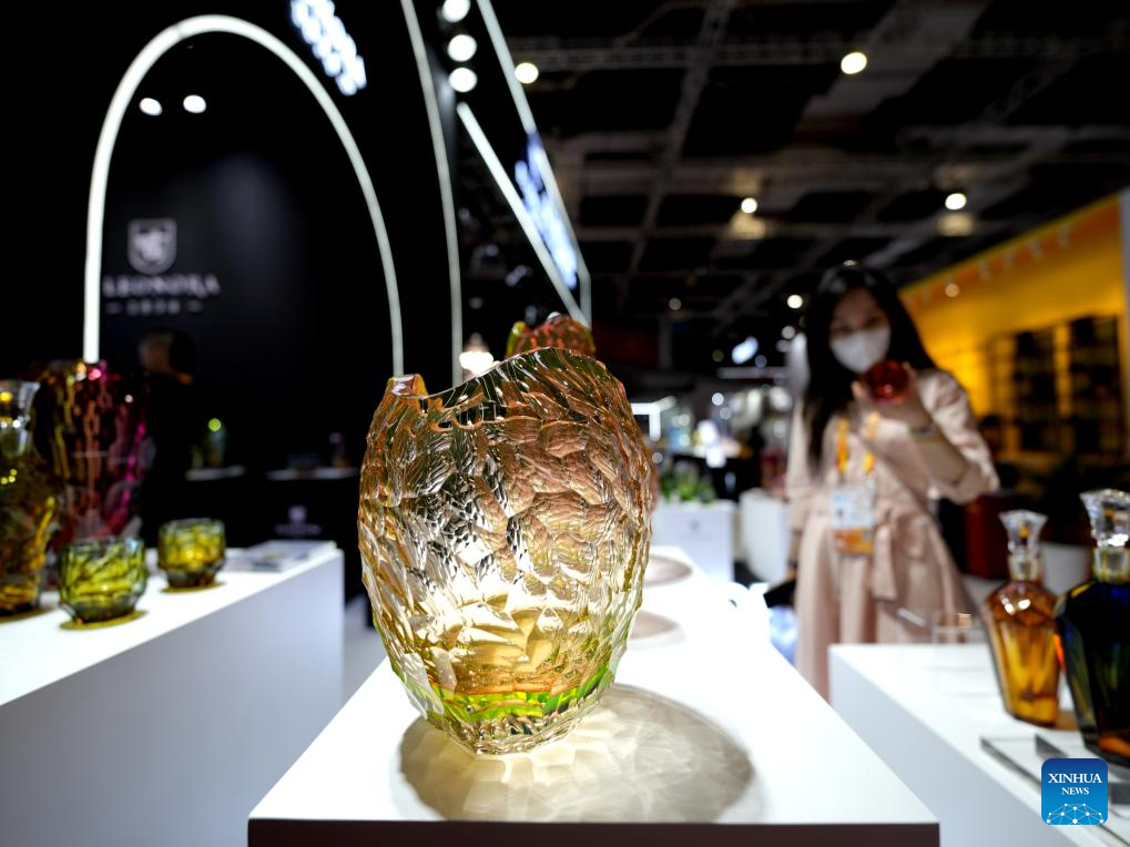 Visitors look at the products of Czech Eleonora crystals at the 6th China International Import Expo (CIIE) in east China's Shanghai, Nov. 5, 2023. The 6th China International Import Expo kicked off here on Sunday, with many cutting-edge technologies and new products making their debuts at the event. (Xinhua/Zhang Jiansong)