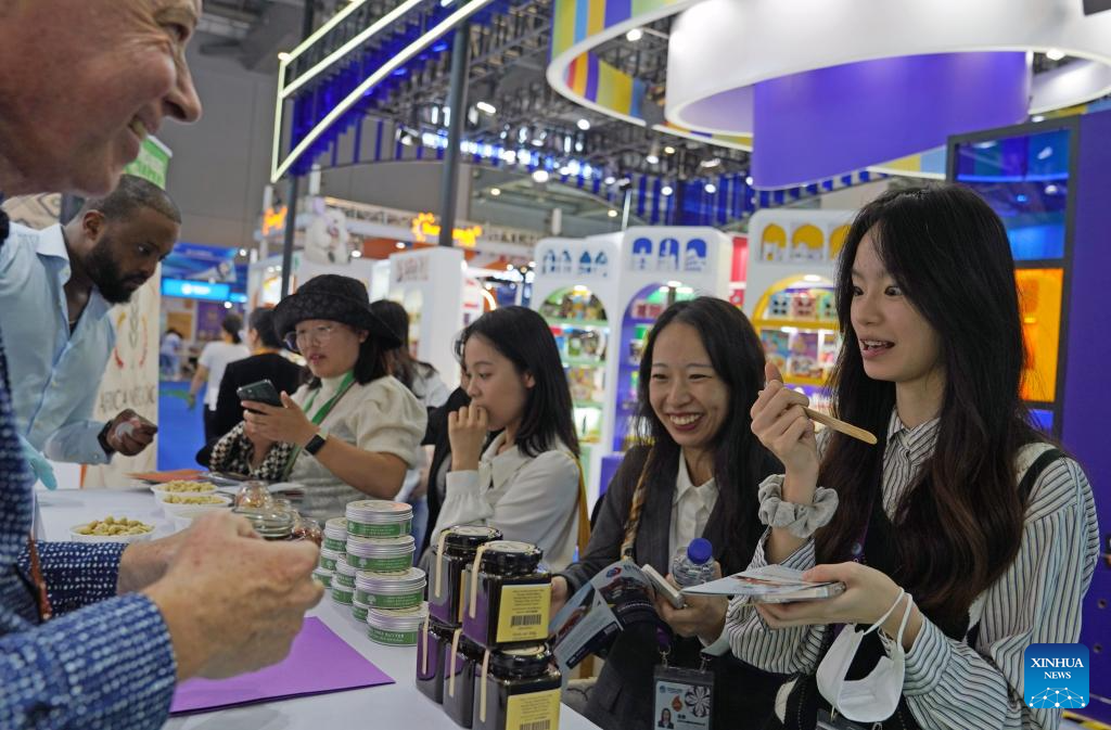 Visitors taste honey from Benin at the 6th China International Import Expo (CIIE) in east China's Shanghai, Nov. 5, 2023. The 6th China International Import Expo kicked off here on Sunday, with many cutting-edge technologies and new products making their debuts at the event. (Xinhua/Liu Ying)