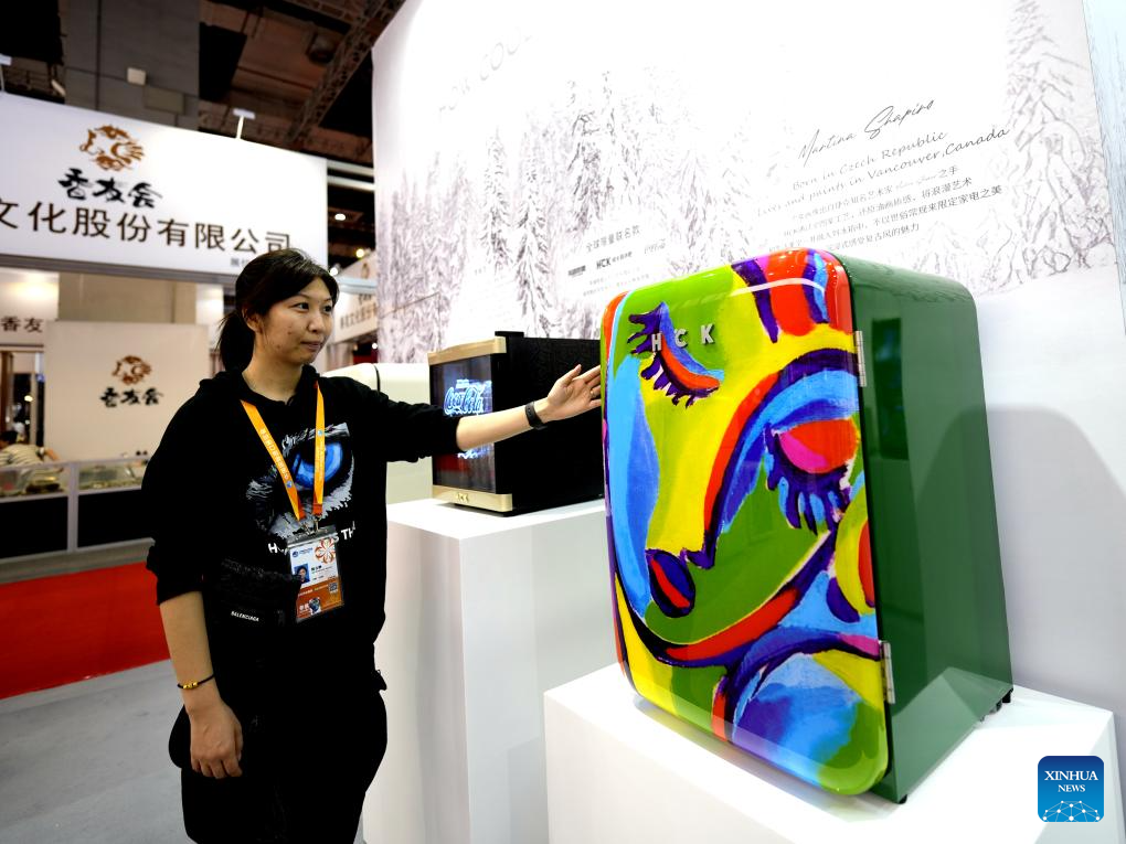 An exhibitor introduces a HCK small bar fridge at the 6th China International Import Expo (CIIE) in east China's Shanghai, Nov. 5, 2023. The 6th China International Import Expo kicked off here on Sunday, with many cutting-edge technologies and new products making their debuts at the event. (Xinhua/Zhang Jiansong)