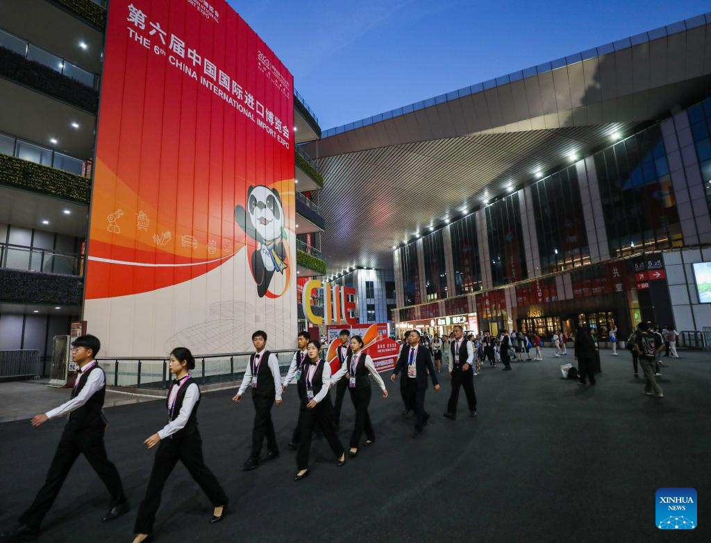 Staff members walk past a giant poster of the 6th China International Import Expo (CIIE) in east China's Shanghai, Nov. 5, 2023. The 6th China International Import Expo kicked off here on Sunday, with many cutting-edge technologies and new products making their debuts at the event. (Xinhua/Xin Mengchen)
