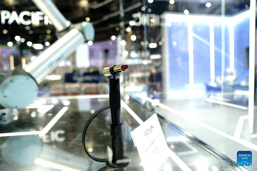 This photo taken on Nov. 5, 2023 shows L'Oreal's handheld intelligent makeup applicator at the 6th China International Import Expo (CIIE) in east China's Shanghai. The 6th China International Import Expo kicked off here on Sunday, with many cutting-edge technologies and new products making their debuts at the event. (Xinhua/Zhang Jiansong)
