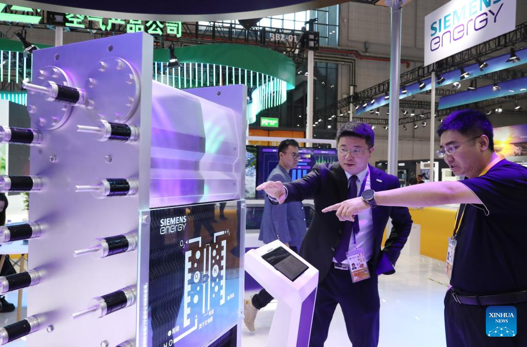 An exhibitor (L) introduces Siemens's hydrogen solutions model at the 6th China International Import Expo (CIIE) in east China's Shanghai, Nov. 5, 2023. The 6th China International Import Expo kicked off here on Sunday, with many cutting-edge technologies and new products making their debuts at the event. (Xinhua/Fang Zhe)