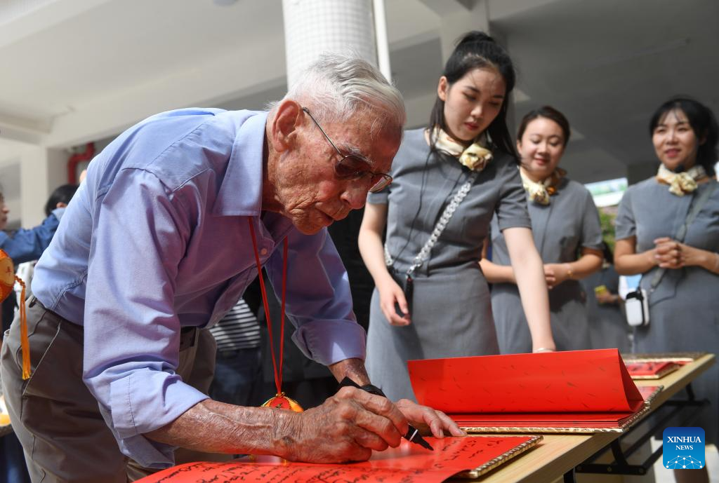 Flying Tigers veteran Harry Moyer (L) signs signature while visiting a middle school in Liuzhou, south China's Guangxi Zhuang Autonomous Region, Nov. 5, 2023. A delegation including Jeffrey Greene, chairman of the Sino-American Aviation Heritage Foundation, and Flying Tigers veterans and their descendants, visited Liuzhou on Sunday. (Xinhua/Lu Boan)