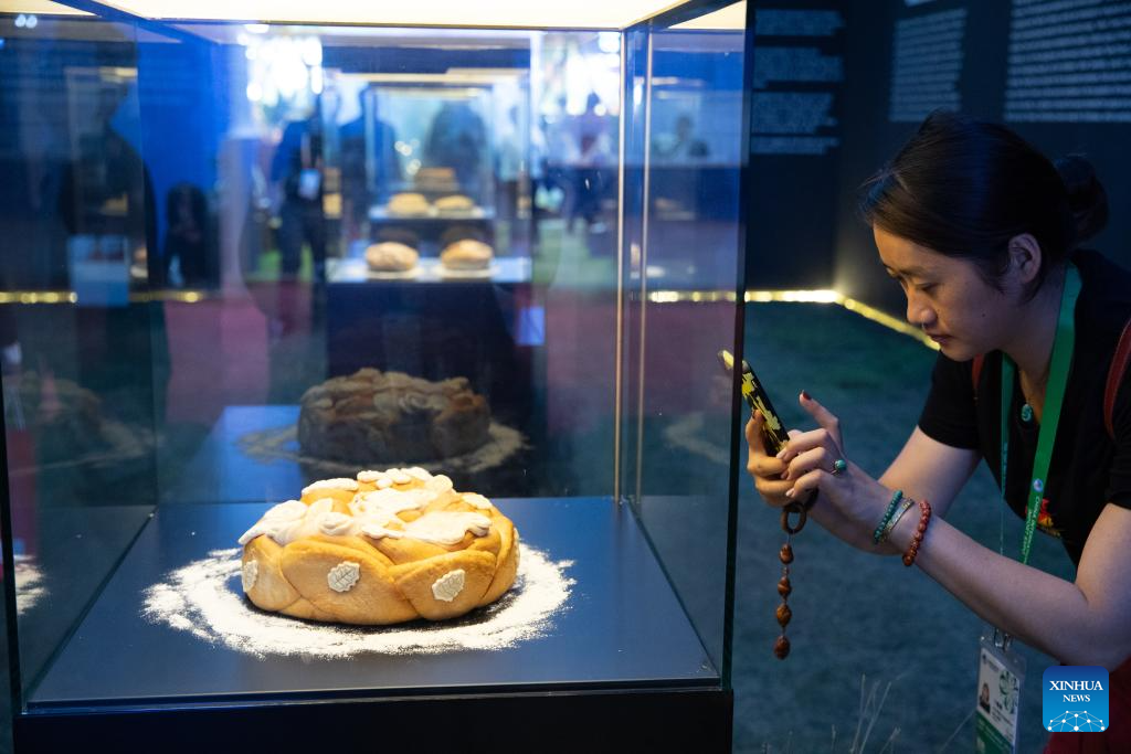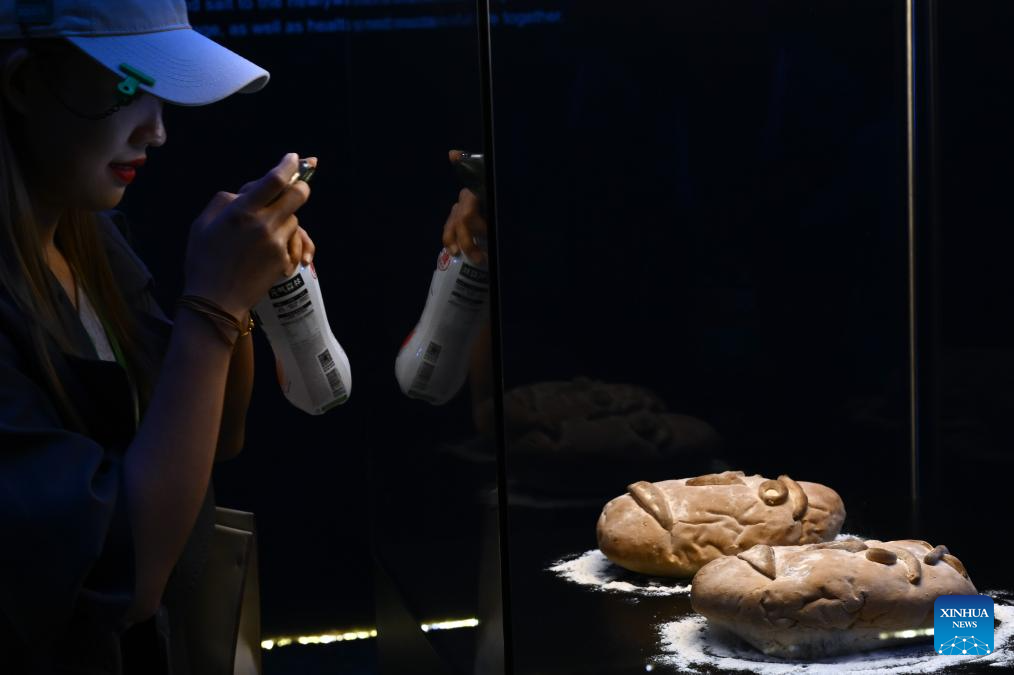 A visitor takes photos of Serbian bread displayed at the booth of Serbia at the 6th China International Import Expo (CIIE) in east China's Shanghai, Nov. 6, 2023. The 6th China International Import Expo is held here from Nov. 5 to 10, with Honduras, Serbia, Vietnam, South Africa and Kazakhstan as its five guest countries of honor. (Xinhua/Jin Liangkuai)