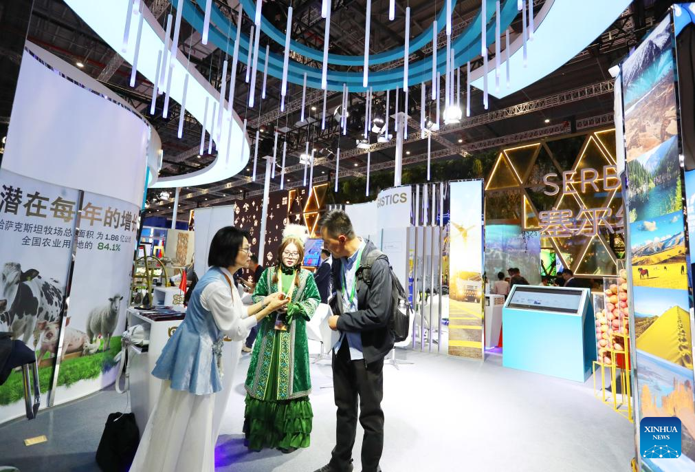 The booth of Kazakhstan is seen at the 6th China International Import Expo (CIIE) in east China's Shanghai, Nov. 6, 2023. The 6th China International Import Expo is held here from Nov. 5 to 10, with Honduras, Serbia, Vietnam, South Africa and Kazakhstan as its five guest countries of honor. (Xinhua/Fang Zhe)