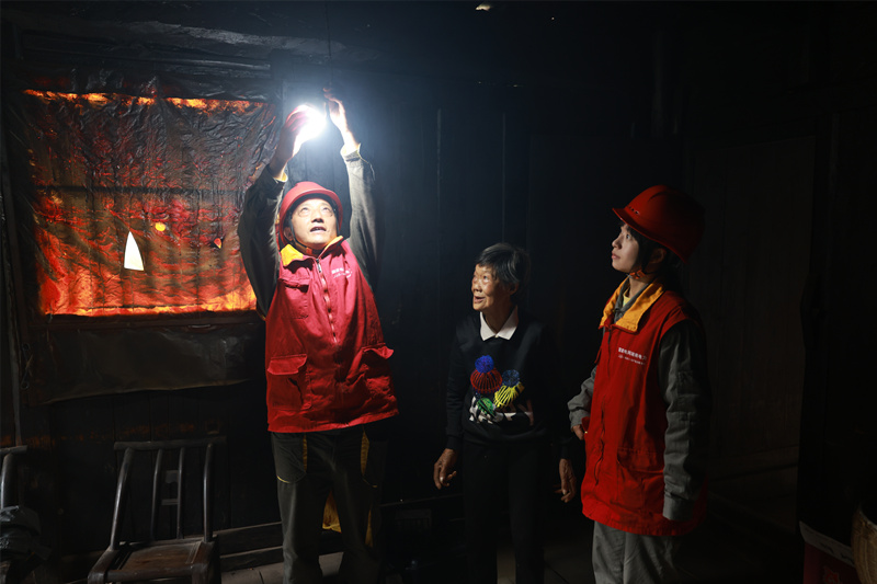 Staff members of a local power supply company help Guan Yin'e change a bulb in Changde, central China’s Hunan Province. (Photo/Peng Hao)