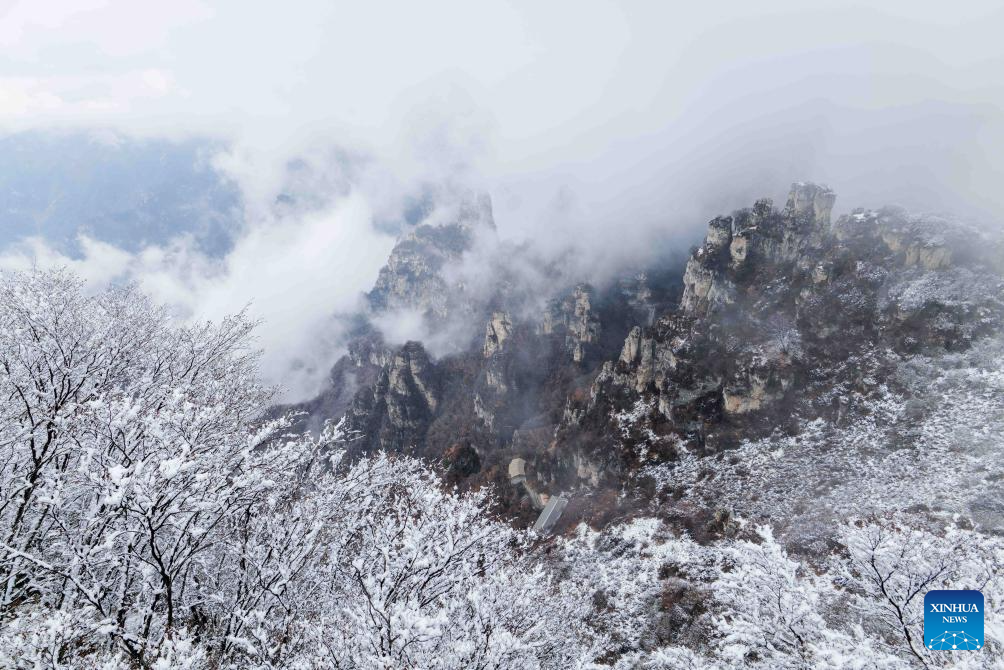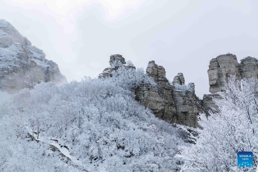 This photo taken on Nov. 5, 2023 shows the scenery of snow-covered Baishi Mountain in Laiyuan County, north China's Hebei Province. (Xinhua/Zhu Xudong)
