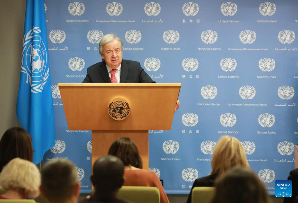 UN Secretary-General Antonio Guterres speaks at a press conference at the UN headquarters in New York, on Nov. 6, 2023. Guterres said Monday that the unfolding catastrophe in Gaza makes a humanitarian cease-fire more urgent with every passing hour. (Xinhua/Xie E)