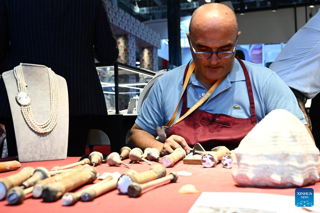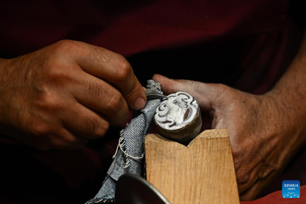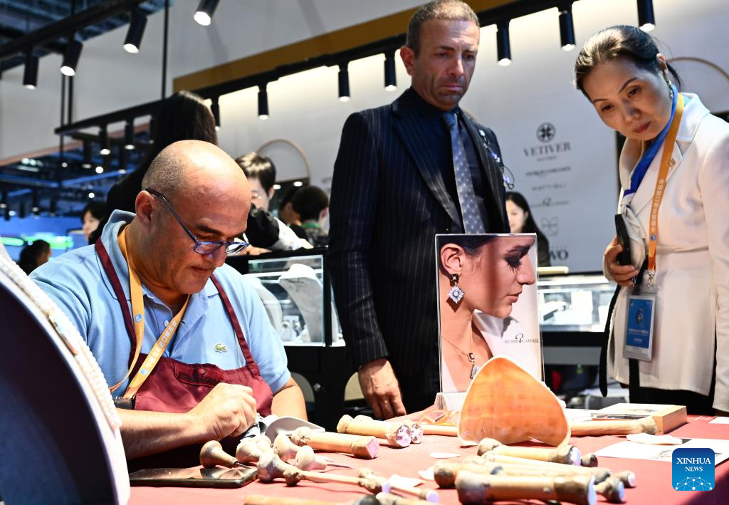 Ciro Esposito shows his shell cameo works at the 6th China International Import Expo (CIIE) in east China's Shanghai, Nov. 6, 2023. Ciro Esposito, nearly 60 years old, was born in a carving family. He has studied the use of carving tools since 7 years old and became famous in Italian market and beyond. It is the third time Esposito has participated in the expo. (Xinhua/Jin Liangkuai)
