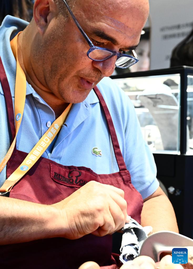 Ciro Esposito carves at the 6th China International Import Expo (CIIE) in east China's Shanghai, Nov. 6, 2023. Ciro Esposito, nearly 60 years old, was born in a carving family. He has studied the use of carving tools since 7 years old and became famous in Italian market and beyond. It is the third time Esposito has participated in the expo. (Xinhua/Jin Liangkuai)