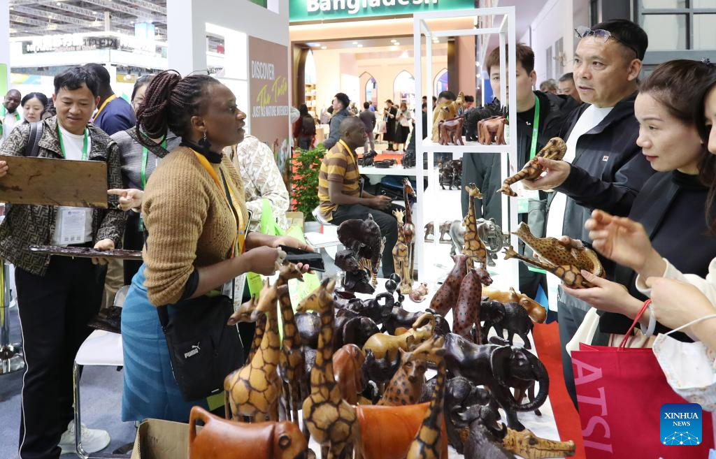 Evidence Chakawa from Zimbabwe introduces woodcarving works in the Country Exhibition zone of the 6th China International Import Expo (CIIE) in east China's Shanghai, Nov. 6, 2023. (Xinhua/Fang Zhe)