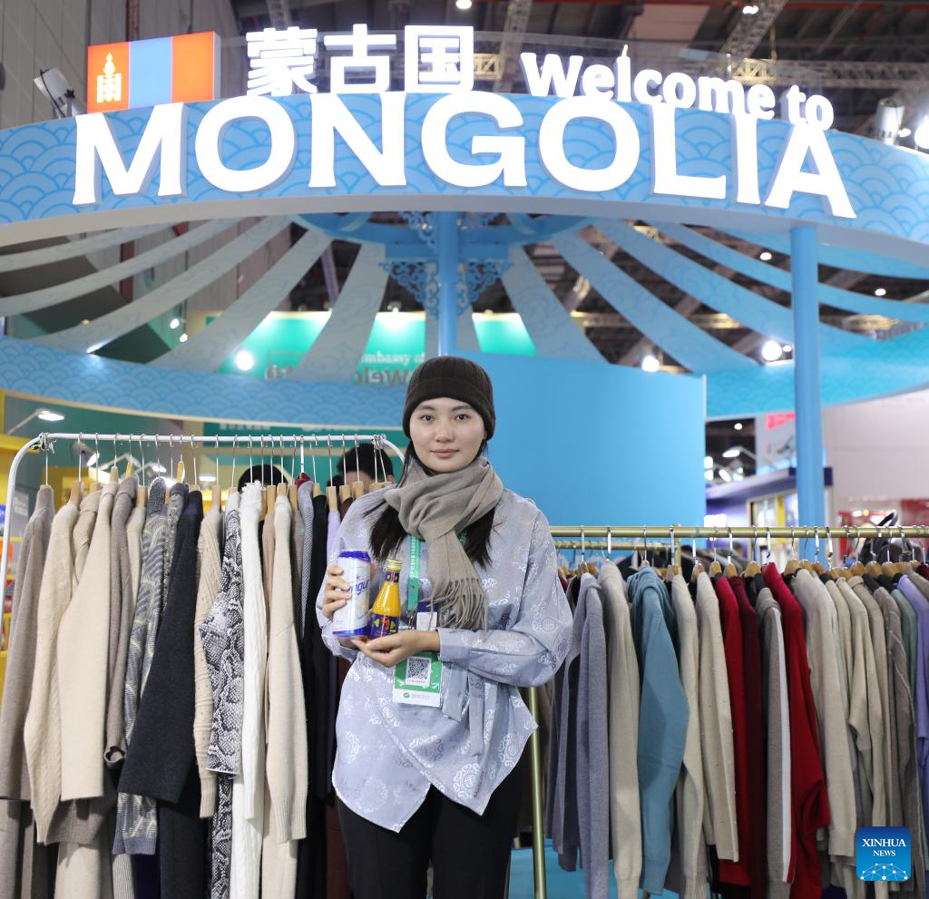 Gantulga Ariunzaya from Mongolia poses for a photo at the booth of Mongolia in the Country Exhibition zone of the 6th China International Import Expo (CIIE) in east China's Shanghai, Nov. 6, 2023. (Xinhua/Li Mengjiao)