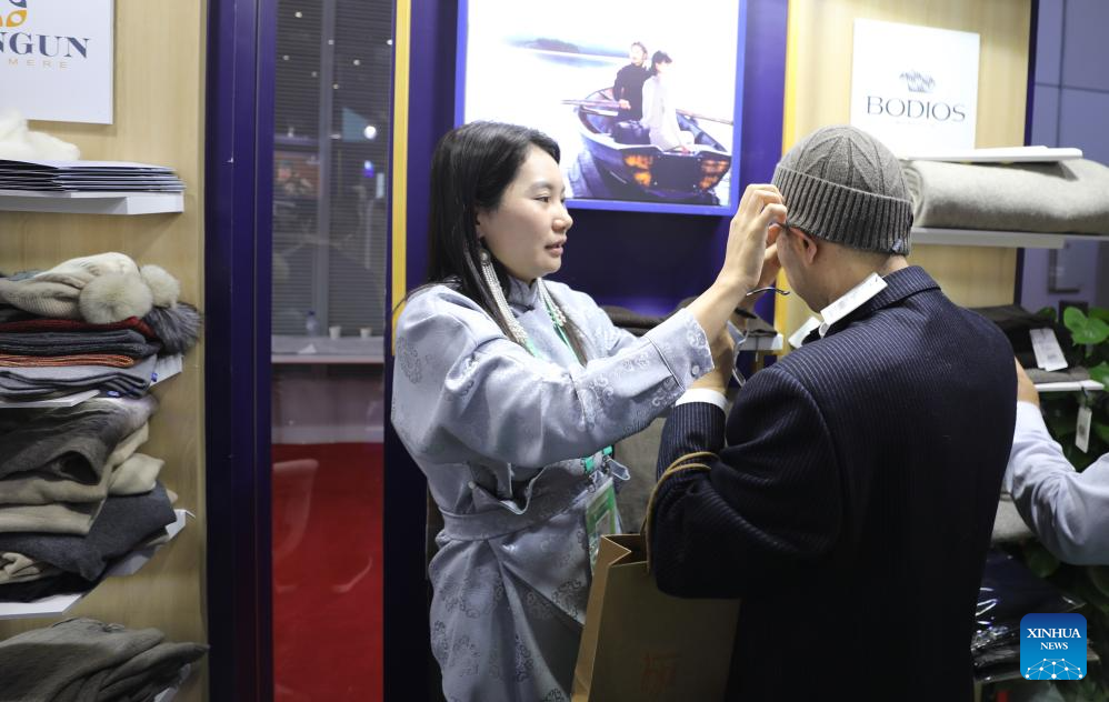 Gantulga Ariunzaya (L) from Mongolia helps a visitor to try on yak wool hat in the Country Exhibition zone of the 6th China International Import Expo (CIIE) in east China's Shanghai, Nov. 6, 2023. (Xinhua/Li Mengjiao)