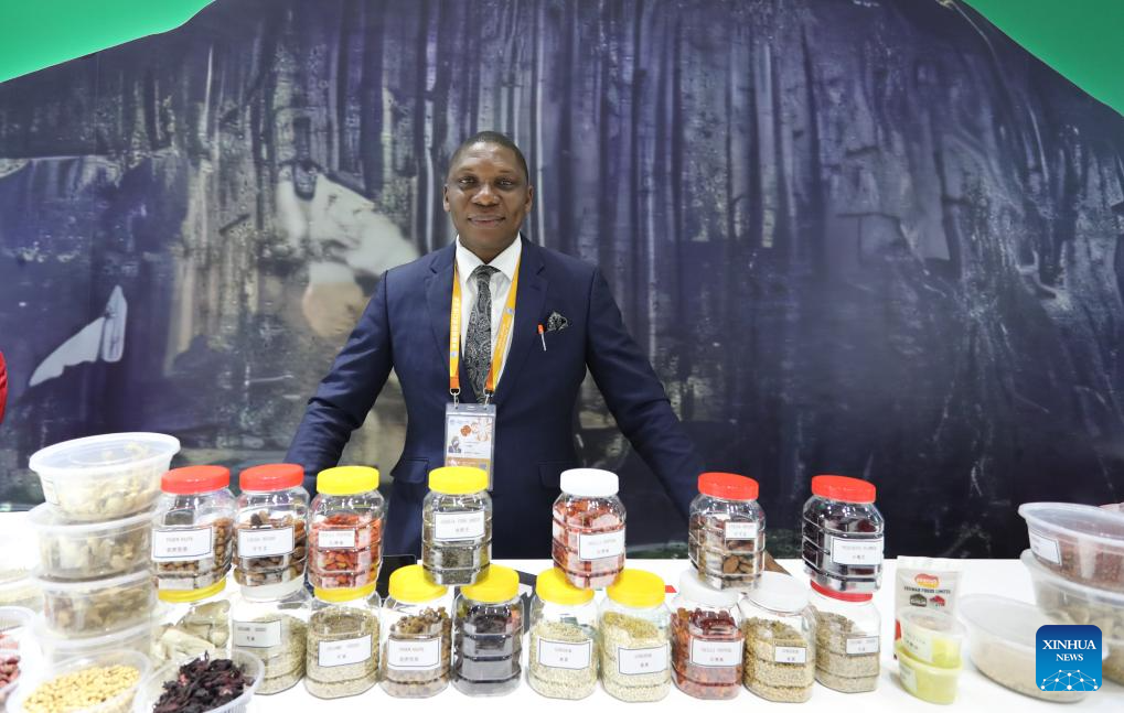 Igbinoba Daniel from Nigeria poses for a photo with his exhibits in the Country Exhibition zone of the 6th China International Import Expo (CIIE) in east China's Shanghai, Nov. 6, 2023. (Xinhua/Fang Zhe)
