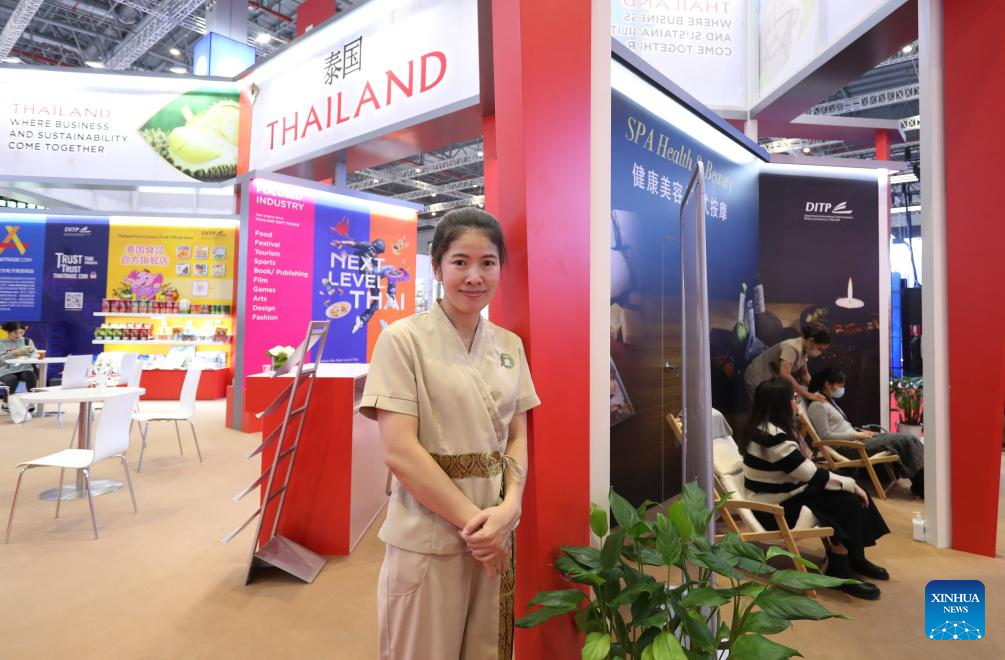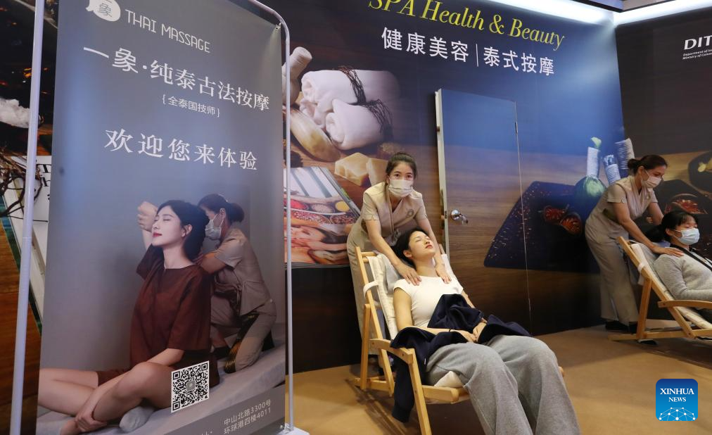 Visitors experience Thai-style massage at the booth of Thailand in the Country Exhibition zone of the 6th China International Import Expo (CIIE) in east China's Shanghai, Nov. 6, 2023. (Xinhua/Fang Zhe)