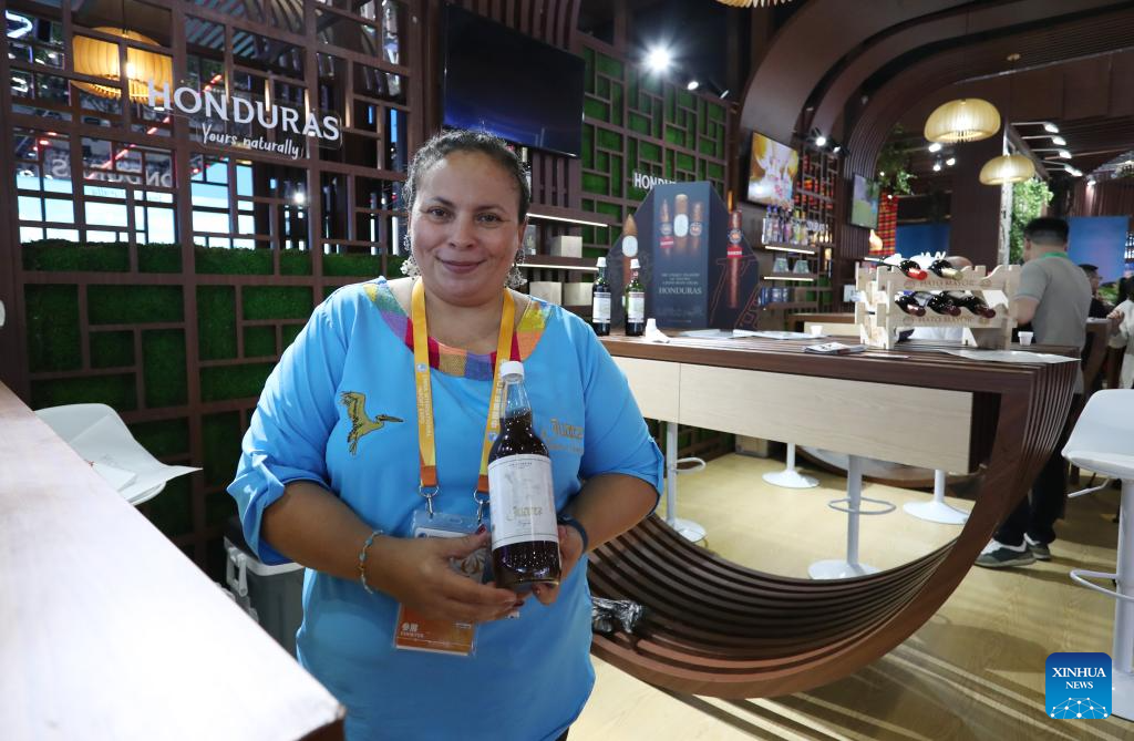 Karen Johanna Pineda Garcia from Honduras shows a bottle of wine in the Country Exhibition zone of the 6th China International Import Expo (CIIE) in east China's Shanghai, Nov. 6, 2023. (Xinhua/Fang Zhe)