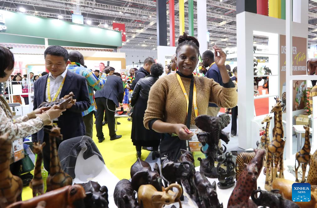 Evidence Chakawa from Zimbabwe stands with the woodcarving works she brought in the Country Exhibition zone of the 6th China International Import Expo (CIIE) in east China's Shanghai, Nov. 6, 2023. (Xinhua/Fang Zhe)