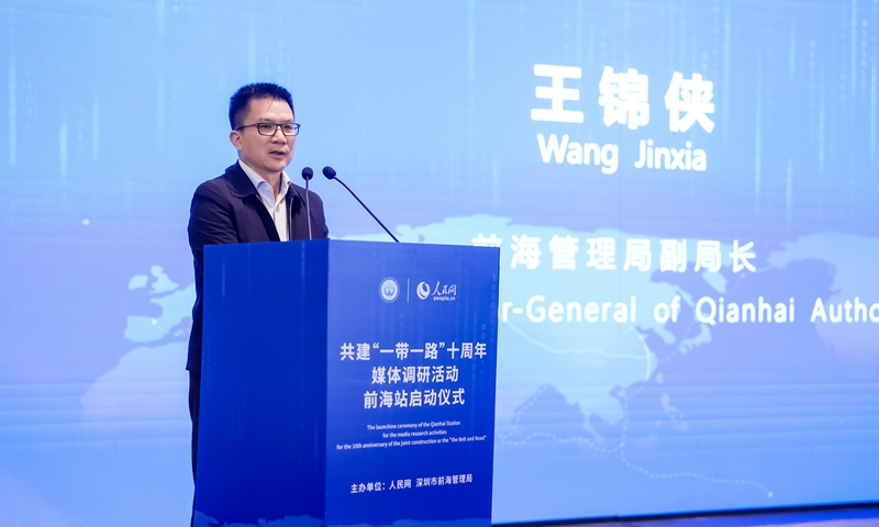 Wang Jinxia, deputy director-general of the Qianhai Authority, delivers a speech at the launch of the Qianhai stop for media research activities on the 10th anniversary of the joint construction of the Belt and Road Initiative. (People's Daily Online/Sun Boyang)