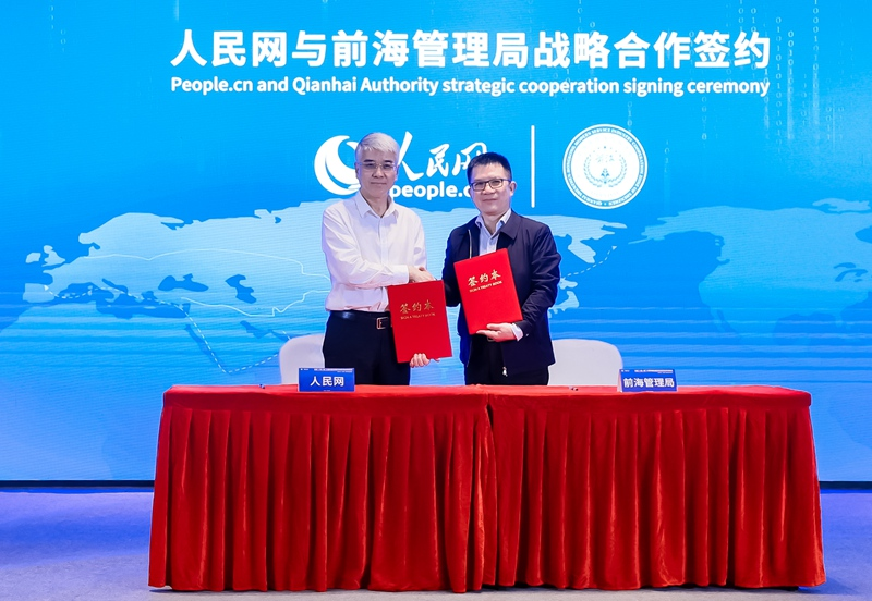 People's Daily Online and the Qianhai Authority hold a strategic cooperation signing ceremony at the launch of the Qianhai stop for media research activities for the 10th anniversary of the joint construction of the Belt and Road Initiative. (People's Daily Online/Sun Boyang)