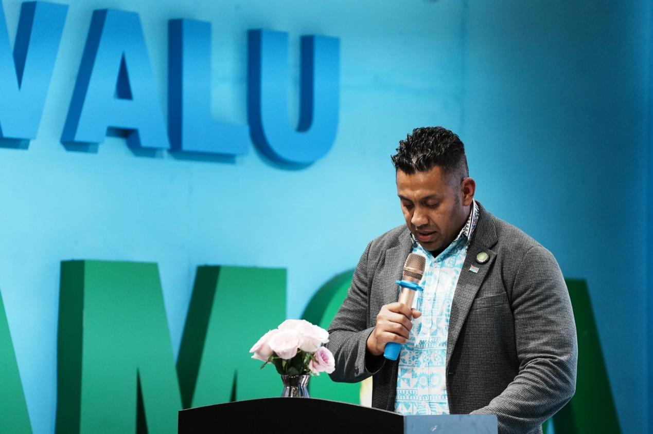 Jimson Fiau Tanangada, the representative of the prime minister of the Solomon Islands, delivers a speech at the inaugural South Pacific Island Countries Cooperation Forum held in Shanghai on Nov. 6, 2023. (People's Daily Online/Peng Yukai)