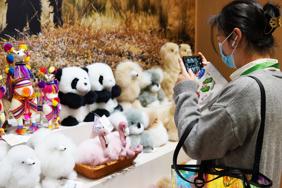 A visitor takes photos of alpaca-fur stuffed toys at the booth of Warmpaca during the 6th China International Import Expo (CIIE) in east China's Shanghai, Nov. 7, 2023. (Xinhua/Li Mengjiao)