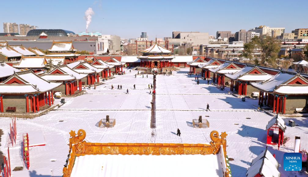This aerial photo taken on Nov. 7, 2023 shows the snow-covered Shenyang Imperial Palace in Shenyang, northeast China's Liaoning Province. Shenyang Imperial Palace was built in 1625 and had been used as the imperial palace in early Qing Dynasty (1616-1911). (Xinhua/Yao Jianfeng)