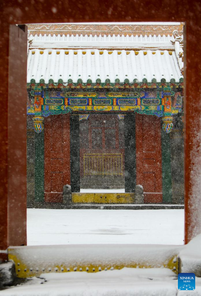 A tourist walks by a gate of the snow-covered Shenyang Imperial Palace in Shenyang, northeast China's Liaoning Province, Nov. 7, 2023. Shenyang Imperial Palace was built in 1625 and had been used as the imperial palace in early Qing Dynasty (1616-1911). (Xinhua/Yao Jianfeng)
