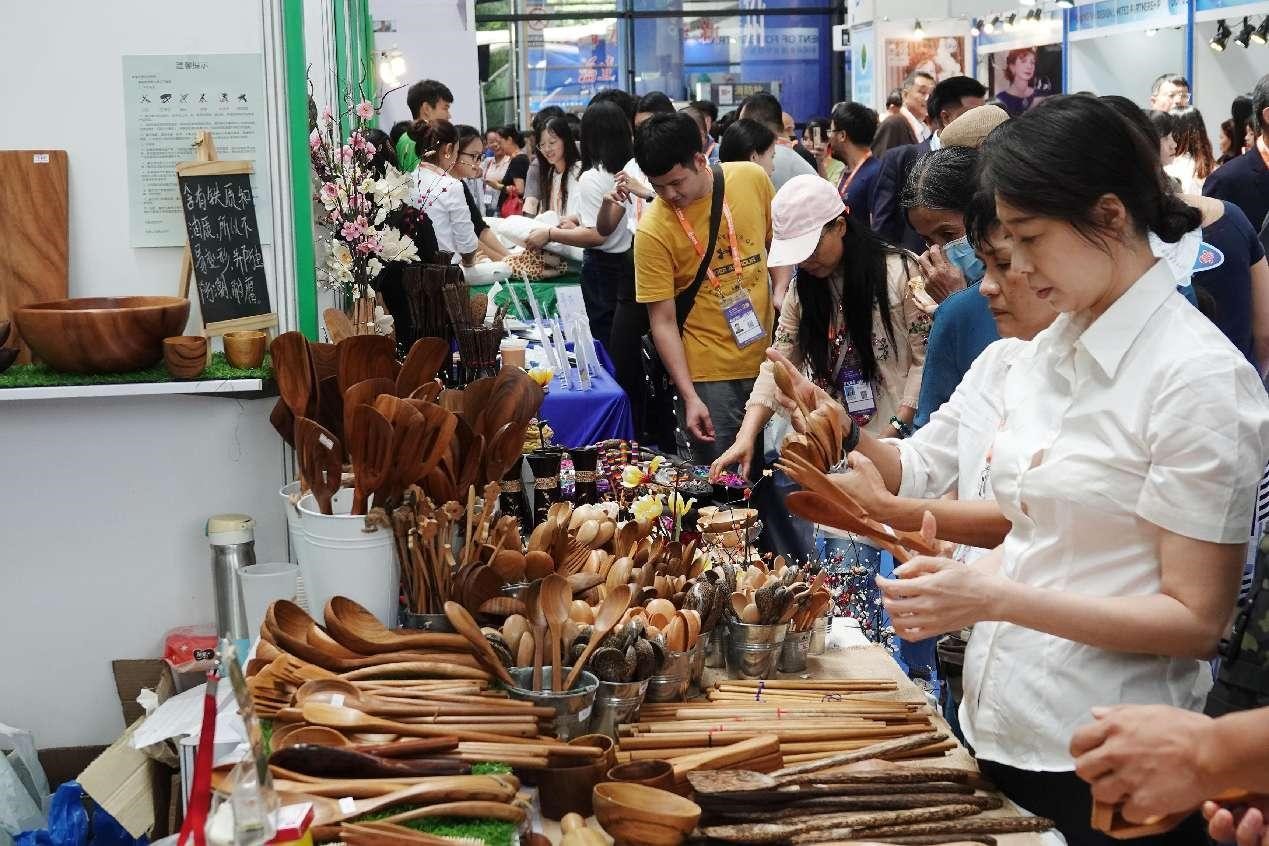 Visitors to the 20th China-ASEAN Expo, which is held in Nanning, south China's Guangxi Zhuang autonomous region, shop wooden handicrafts made in Thailand, Sept. 16, 2023. (People's Daily Online/Yu Xiangquan)