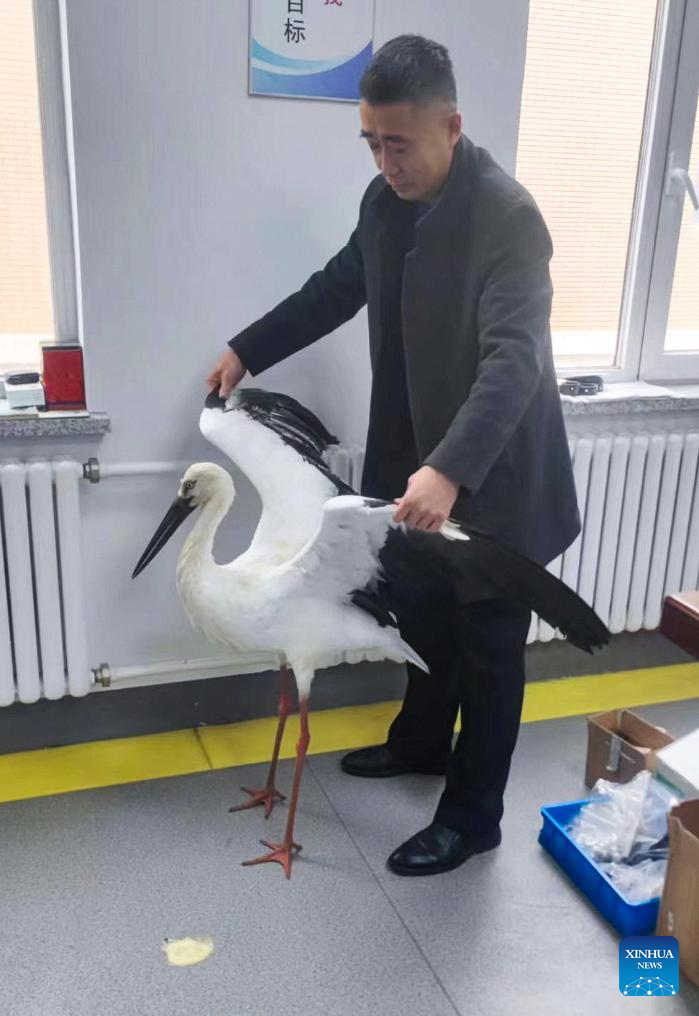 A staff member checks the wings of an oriental white stork rescued at the wildlife rescue center in Changchun, northeast China's Jilin Province, Nov. 6, 2023. (Xinhua)