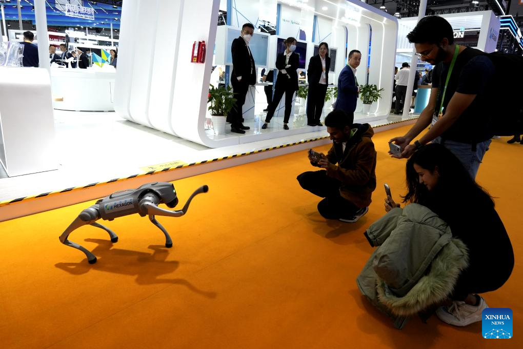 Visitors interact with a Hexagon robot dog at the intelligent industry and information technology exhibition zone of the 6th China International Import Expo (CIIE) in east China's Shanghai, Nov. 7, 2023. The artificial intelligence technology on display at the 6th CIIE attracted a lot of visitors. (Xinhua/Zhang Jiansong)