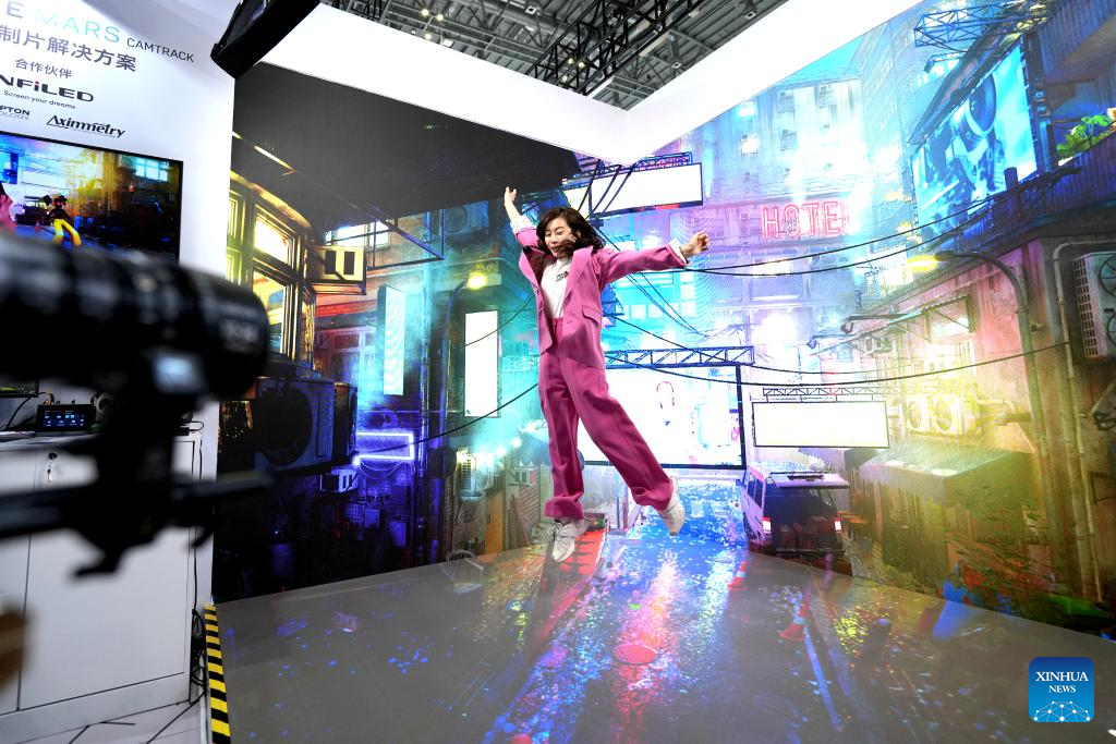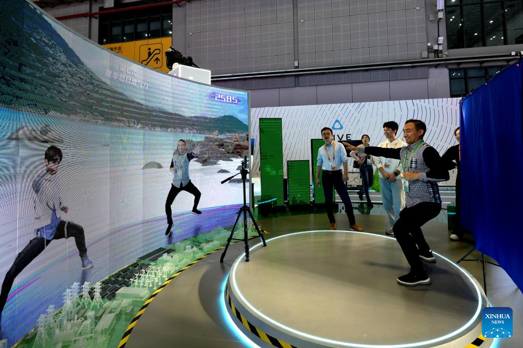 A visitor experiences virtual production equipment at the intelligent industry and information technology exhibition zone of the 6th China International Import Expo (CIIE) in east China's Shanghai, Nov. 7, 2023. The artificial intelligence technology on display at the 6th CIIE attracted a lot of visitors. (Xinhua/Zhang Jiansong)
